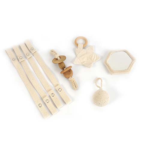 Los accesorios 360º Polluelo son el complemento perfecto para tu gimnasio. Incluyen 4 cintas adaptables de distintas alturas para combinar como quieras. Todos los objetos son mordedores y sonajeros desmontables, que ademas de colgarlos, puedes usarlos de forma independiente en el coche, auto o colchoneta.