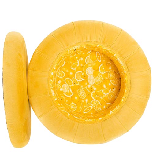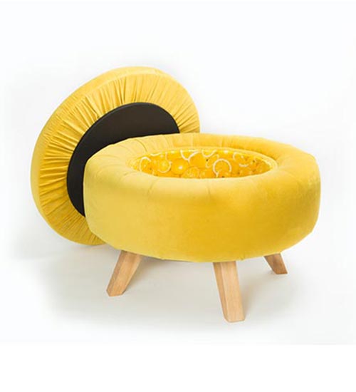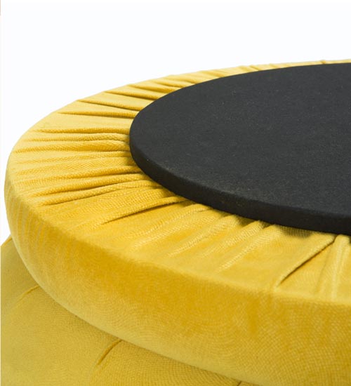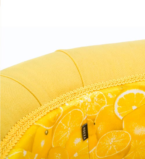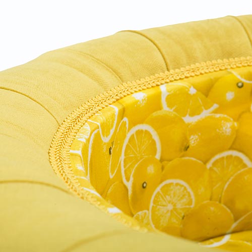 Este modelo «Paul» premium con almacenaje sirve tanto de asiento como de reposapiés. Tapiz de color amarillo que se combina perfectamente con la tela estampada de limones al  interior del baúl, dándole un toque de frescura sorprendente. Mueble sustentable – hecho con un neumático fuera de uso. Todos los materiales usados en su fabricación fueron elegidos cuidadosamente para entregar un producto de diseño original y alta calidad.