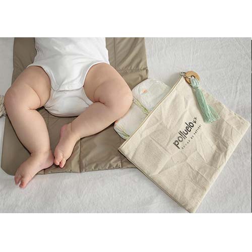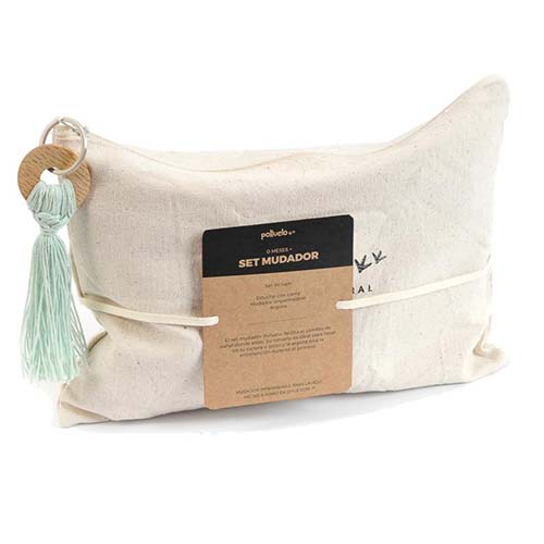 Materiales: Estuche 100% algodón. Argolla de madera con cordón de algodón teñido con tinte comestible. Mudador impermeable por ambos lados.