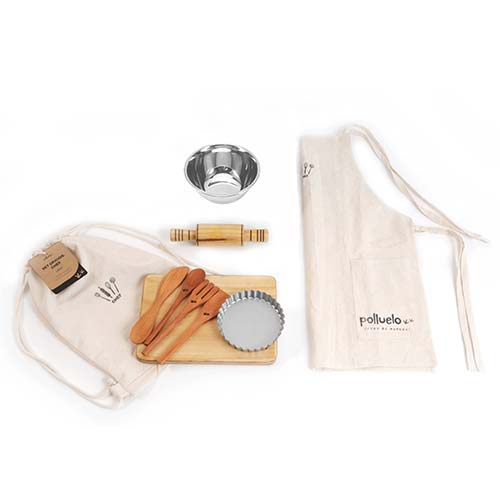 Cuidados: Para la limpieza, puedes lavar los implementos tal como lo haces con los utensilios de la cocina. La bolsa y delantal de tela en la máquina lavadora en un ciclo normal a máx. 30º. Recomendamos que guardes los utensilios de madera dentro de su bolsa de género o en una bolsa respirable.
